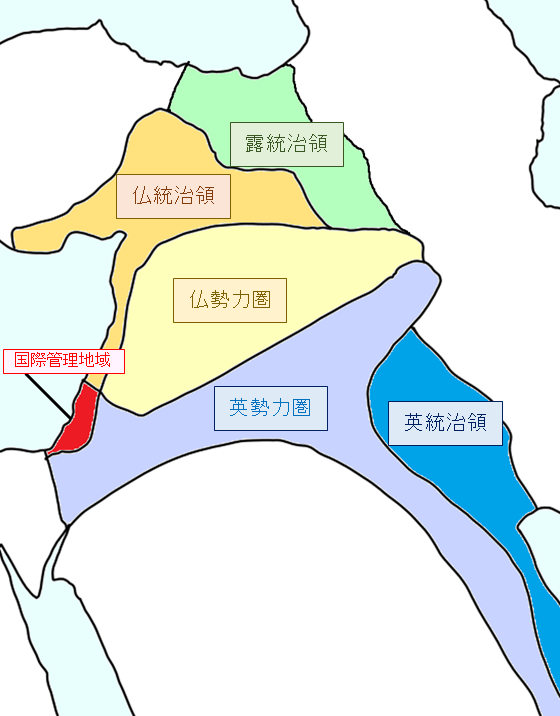 :基本問題です。この協定は英・仏・露で結ばれましたが、よく出てくる下の地図にはロシアの支配地が描かれていません。これは、ロシアの支配地とされたのがボスフォラス・ダーダネルス両海峡周辺とされてこの地図の中におさまらないことが原因で、ロシアは同協定に参加しています。ですが、1917年にロシア革命が発生すると、この秘密協定は暴露されて、この協定を締結した主体であるロシア帝国は滅亡します。その結果、第一次世界大戦後の中東地域は英・仏を中心にその実質的支配下に置かれることとなりました。
